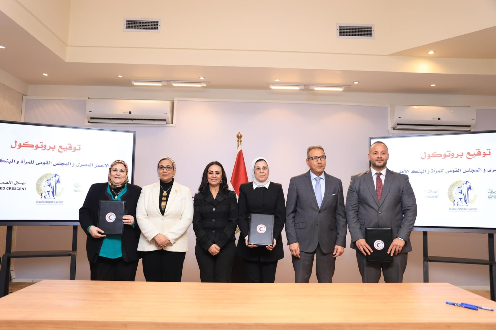 The protocol signing ceremony was in the presence of Dr. Maya Morsy, Minister of Social Solidarity and Vice Chair of the Egyptian Red Crescent; Mohamed El-Etreby, CEO of the National Bank of Egypt; Counselor Amal Ammar, President of the National Council for Women; Dr. Sahar El-Sonbaty, President of the National Council for Childhood and Motherhood; and Dr. Khaled Hamdy, President of Ahram Canadian University. Several other leaders from national institutions and academic bodies were also present.